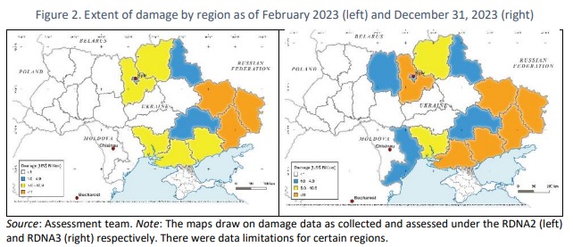 В отчете также говорится, что в Украине повреждено или разрушено 10% жилищного фонда, что привело к длительному перемещению украинцев из их общин. Наиболее пострадавшими секторами есть жилищный сектор, транспорт, торговля и промышленность, энергетика и сельское хозяйство. Наибольший ущерб сосредоточен в Донецкой, Харьковской, Луганской, Запорожской, Херсонской и Киевской областях.